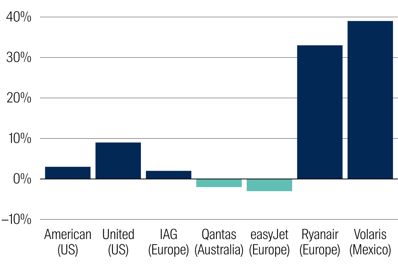 Then during late 2023 and 2024 we saw improvements in seat capacity as more planes returned to the skies and operational readiness improved. We saw low‑cost carrier (LCCs) such as Ryanair in Europe and Volaris in Mexico perform particularly well, with their operating agility and healthy balance sheets allowing them to move more quickly to capitalise on strong traveller demand. Unfortunately for travellers whilst the experience started to improve, ticket prices remained elevated. Strong traveller demand resulted in any additional capacity being quickly absorbed, allowing airlines to largely sustain the pricing gains they’d made.