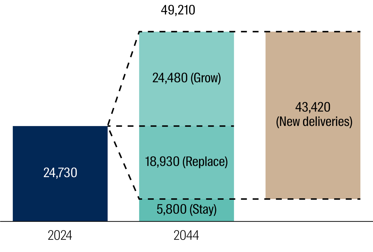 The key constraint we see to further upside to traffic growth in the near‑term is the lack of new aircraft becoming available to continue to satisfy demand growth. The world’s two dominant aircraft manufacturers, Boeing and Airbus, remain nowhere near their previous rates of aircraft production. Total industry output is still running 30% below the highs seen in 2018. This hasn’t stopped them from taking orders for new planes though, with outstanding orders for new planes reaching a record high of over 17,000.2