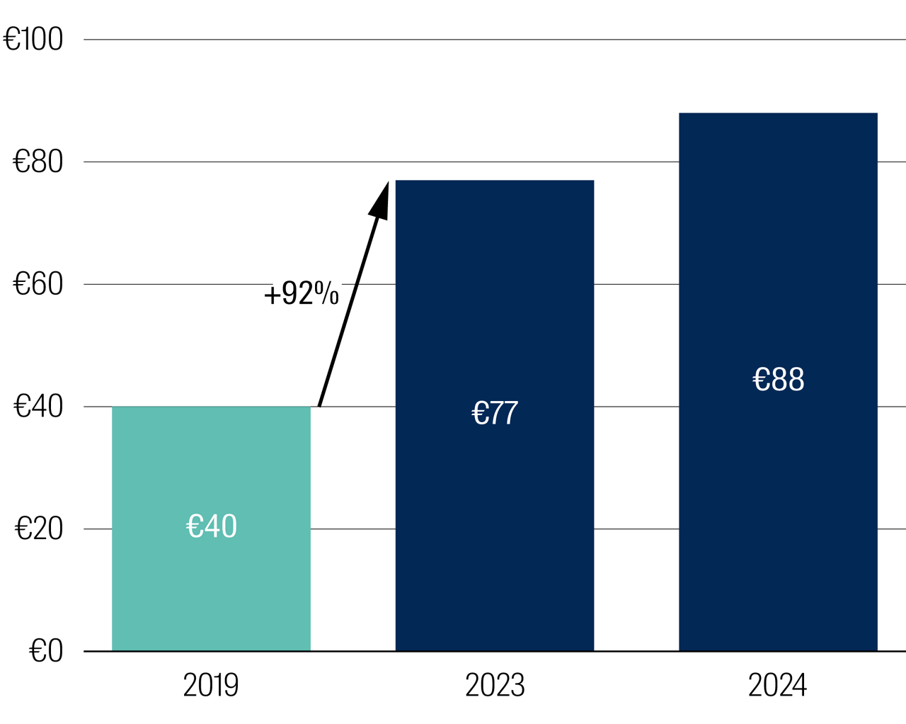 Groupe ADP is another portfolio company that identified India as a growth market early, acquiring a 49% interest in leading listed Indian airport operator GMR for €1.36 billion in February 2020. This stake today is worth over €4 billion based on market pricing,5 a 3x increase on their initial investment. We believe the market is placing very little value on this investment currently; something which we believe could shift as GMR management increasingly focuses on returning capital to shareholders via dividends as the company moves out of its capital‑intensive investment phase.