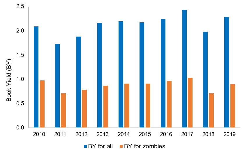 - Zombie firms do not have good long term characteristics, as we know, so the chance for them to recover and add value is limited.