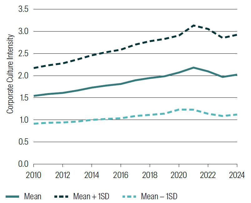Using the dictionaries from Li et al (2021) we use a bag of words approach on the conference call transcripts for all the five corporate values. The more the words are mentioned, the stronger the culture of the firm.