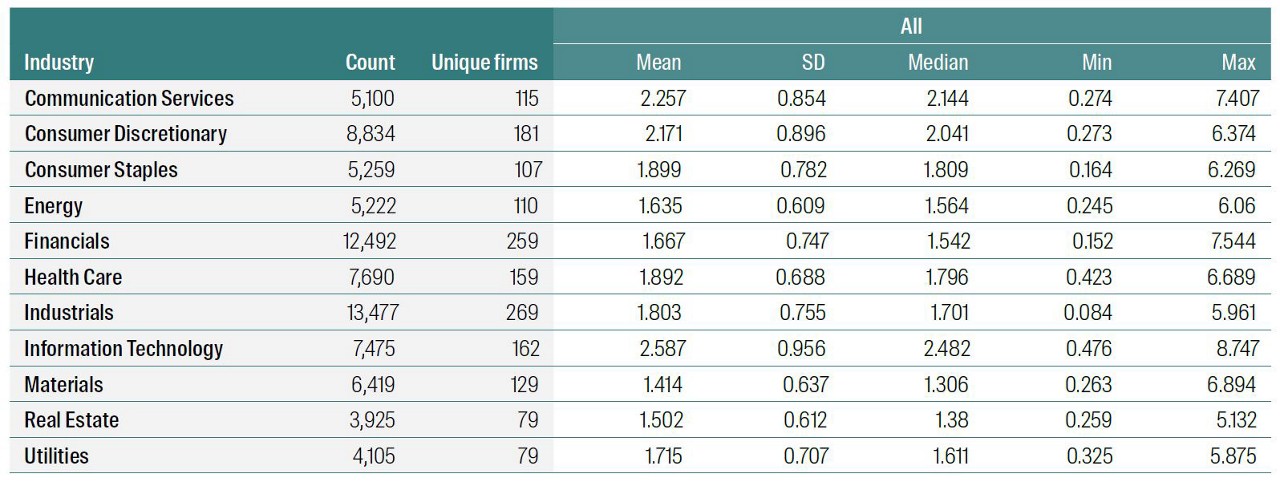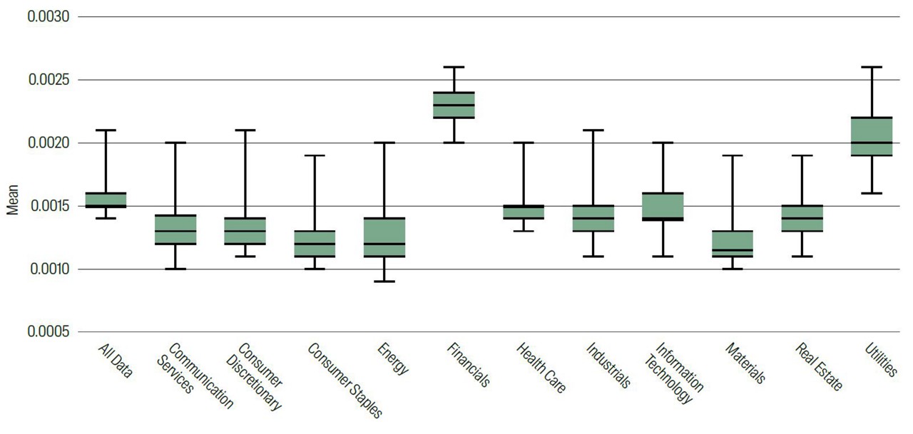 We go further to provide some descriptive statistics for each sector – both at the overall level as well as split out between the five different corporate values. See Table 1 below. What is interesting is that it is only the value ‘respect’ that is mentioned across all firms over time. For other values (e.g., integrity, teamwork and quality), there are at least some firms within the sectors that do not mention any of the words associated with the value in the conference call (as shown by the score of 0 for the min value).