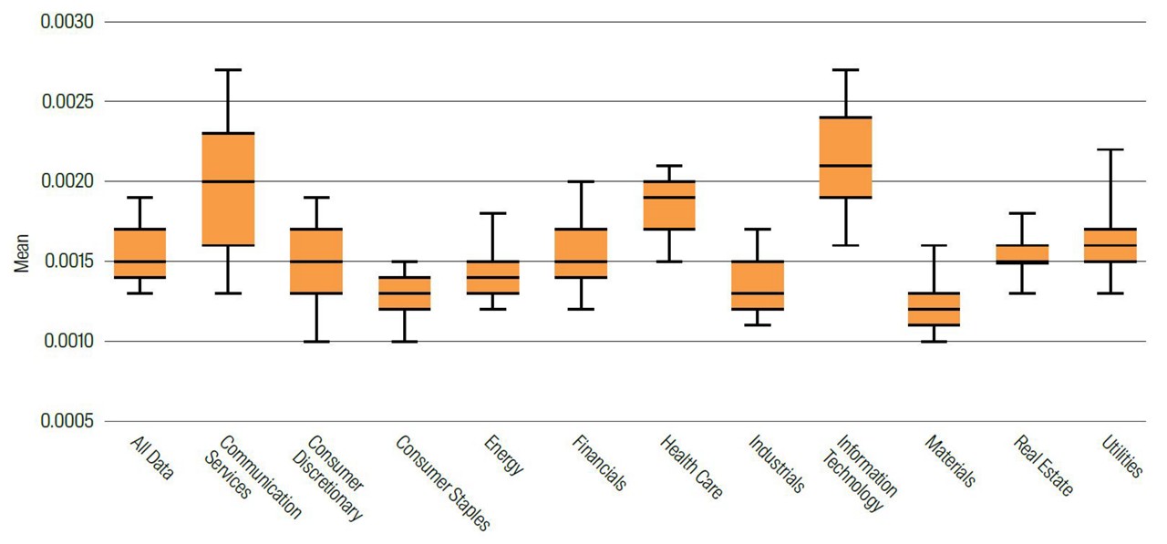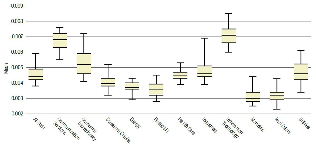 We can go further. When we look at the five underlying corporate values, we can also see that different industries have a focus on different corporate value. This is not surprising. For example, IT firms and communication services have more mentions of innovation but financials talk more about integrity (probably to address previous issues!). The distribution of mentions by sector for the five corporate values are in Figures 2 to 6 below. These charts show the distribution of the mentions with the box representing where the middle 50% (also known as the interquartile spread) of the mentions lies.