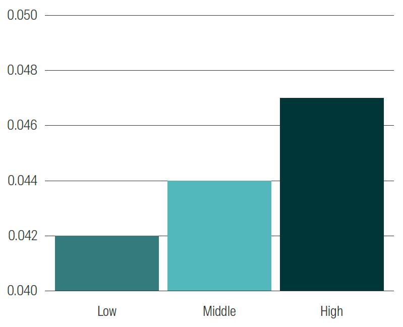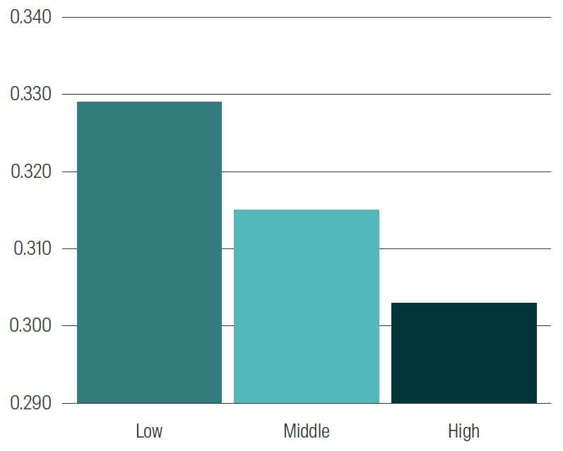 Having determined a way to measure culture we look at the attributes it reflects of the company. We would hope that companies with better culture would also be better managed firms and hence be of higher quality. We would also expect them to be less risky and volatile for the same reason. We looked to see if this is the case in our data set. We split the companies into three groups, those with low, middle and high culture scores and looked at the average return on assets (ROA) as a proxy for quality and volatility as a proxy for risk. We can see the results in Figure 7 below.