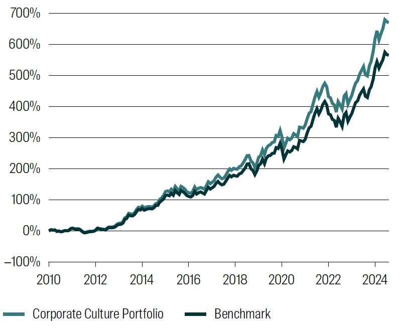 Over the nearly 14 year period we can see that the corporate culture tilted portfolio has outperformed the benchmark. This consistency in performance over this period shows that this firm attribute of strong corporate culture is one that is rewarded by the market. This performance is just over 1% return p.a over the approx. 14-year period.