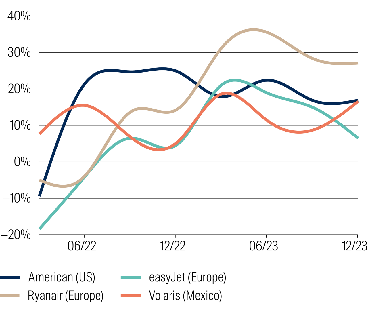 Then during late 2023 and 2024 we saw improvements in seat capacity as more planes returned to the skies and operational readiness improved. We saw low‑cost carrier (LCCs) such as Ryanair in Europe and Volaris in Mexico perform particularly well, with their operating agility and healthy balance sheets allowing them to move more quickly to capitalise on strong traveller demand. Unfortunately for travellers whilst the experience started to improve, ticket prices remained elevated. Strong traveller demand resulted in any additional capacity being quickly absorbed, allowing airlines to largely sustain the pricing gains they’d made.