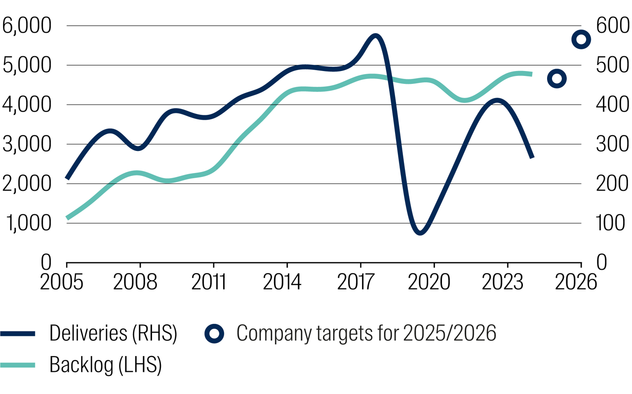 The key constraint we see to further upside to traffic growth in the near‑term is the lack of new aircraft becoming available to continue to satisfy demand growth. The world’s two dominant aircraft manufacturers, Boeing and Airbus, remain nowhere near their previous rates of aircraft production. Total industry output is still running 30% below the highs seen in 2018. This hasn’t stopped them from taking orders for new planes though, with outstanding orders for new planes reaching a record high of over 17,000.2
