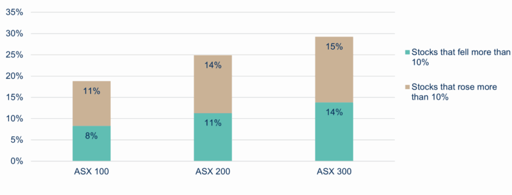 The ASX100 is also less volatile than its ASX200 and ASX300 counterparts. Shown below is the average number of stocks with monthly share price movements over 10 per cent over the past 15 years. While the ASX100 is less volatile than the broader market, this segment is still subject to significant share price movements. These movements (both up and down) are magnified when geared.